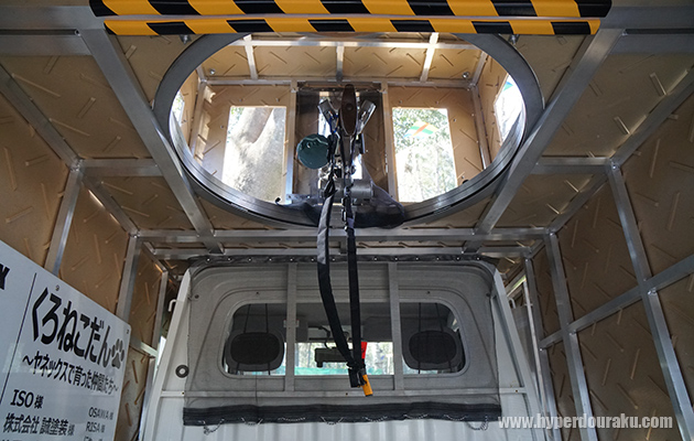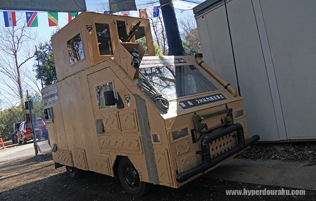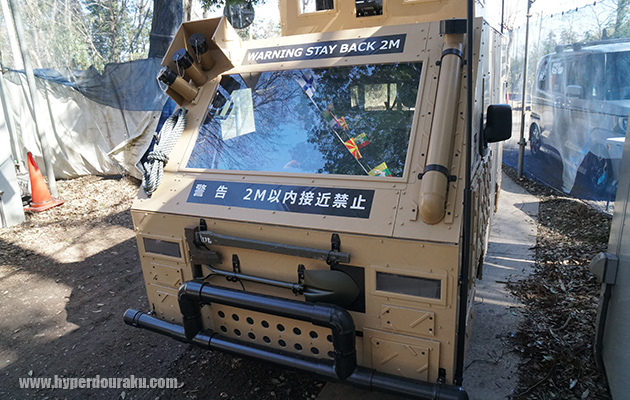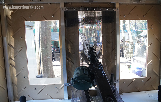 後部にも銃座がある。ガントラ内はすべて被弾無効の無敵状態なので、ヒットを気にすることなく射撃に集中できる。運転はスタッフが行い、走行中はBGMを大音量で流して車両位置をアピールしている。