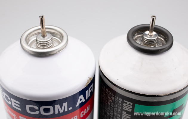 ガス缶を直接取り付けるとこのようなスタイルとなる。のちにガスホースによってパワーブースター等の外部ソースとなり、パワーソースもフロンガスだけでなく、圧縮空気を使用するエアータンクも使用された。