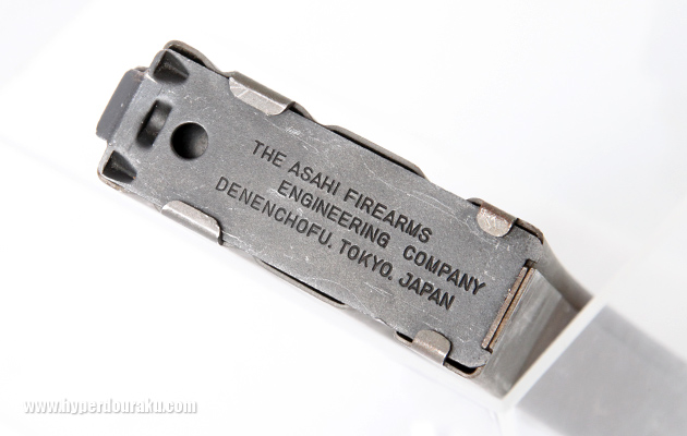 マガジンボトムプレートにはアサヒファイヤーアームズのオリジナル刻印が。自社製品にプライドを持つ証しだといえる。