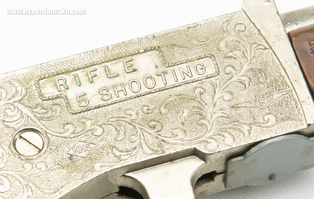 レシーバーはダイキャスト製で、こちらにもエングレーブ風の模様が施されている。ハンマーをコックするとストライカーが飛び出す。リアサイトはない。