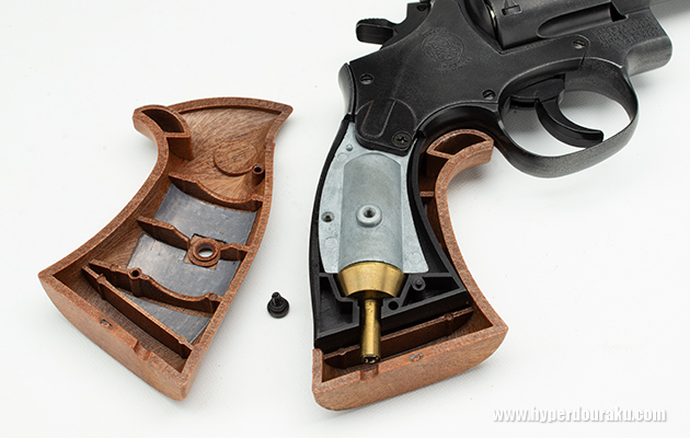 シリンダーをスイングアウトして、カートリッジを6発装填する。金属製カートだが筒状で、リムの刻印は無い。グリップ内のガスタンクから導かれたガスを通して弾頭部にセットされたBB弾をバレルへと押し出す仕組みだ。また、インナーバレル入り口はOリングがあり、シリンダーギャップからのガス漏れを極力防ぐようになっている。数ミリ先にはシリコンゴム製だろうか、白いゴム管が上部にあり、固定ホップアップとなっている。