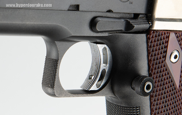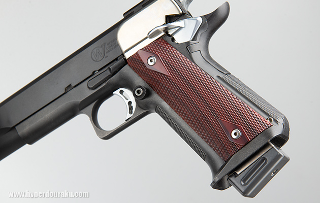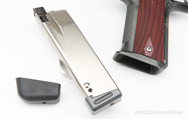 ダイヤモンドチェッカーグリップは樹脂製だが、これを木製グリップに変更すればさらに高級感が増しそうだ。ビーバーテイルのグリップセフティはコンペティションガンらしく固定されている。メインスプリングハウジングはストレートタイプ。大型のマグウェルで素早いマグチェンジにも対応するが、ハンマーを起こした状態でマガジンを出し入れしないと破損してしまうのが難点。