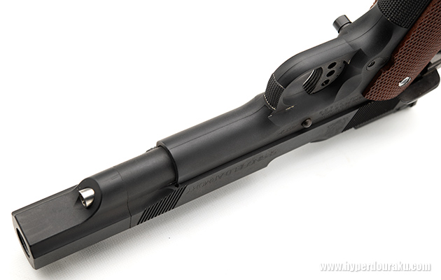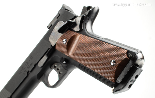 木製チェッカーグリップパネルが標準装備。左面にはフィンガーレストの削りが入っている。メインスプリングハウジングはストレートタイプ。ビーバーテイルのグリップセーフティはオミットされた仕様。LEと同じマグウェルも装備している。