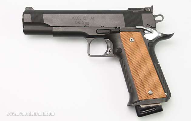 キャスピアンのハイキャパシティフレームを再現しているが、全体的なリアルさはさすがMGCだ。グリップはプラ製だが、木目がプリントされなかなか高級感がある。