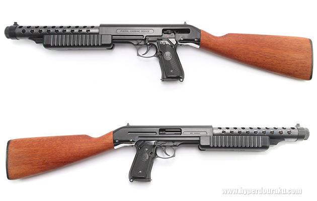 思うにトイガンメーカーというものは、ある特定のハンドガンがヒットすると、ついそれをカービン化したくなるものなのだろうか。古くは金属製モデルガンのワルサーP38アンクルカービン、エアガンの時代に入ってからはMGCのベレッタM93Rカービンにグロック18カービン、そしてこのマルシン ベレッタM92Fピストル・カービンディバイスのように、である。