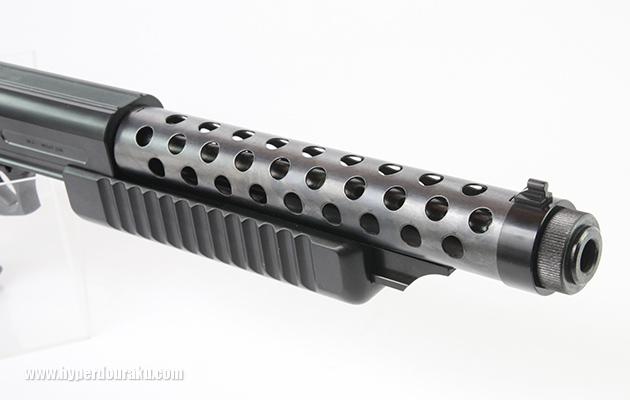 スチールプレス製のバレルジャケット。クーリングホールのおかげで、カービンというよりサブマシンガンのような雰囲気を醸し出している。