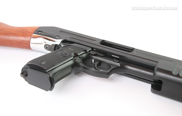 フォアエンドを引いてスライドをコッキングした状態。また本キットは当時発売されていたスライド固定式ガスガンにも共用できた。