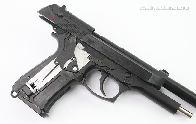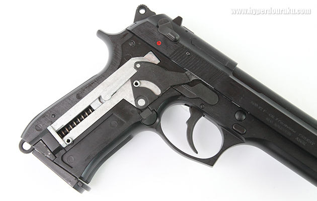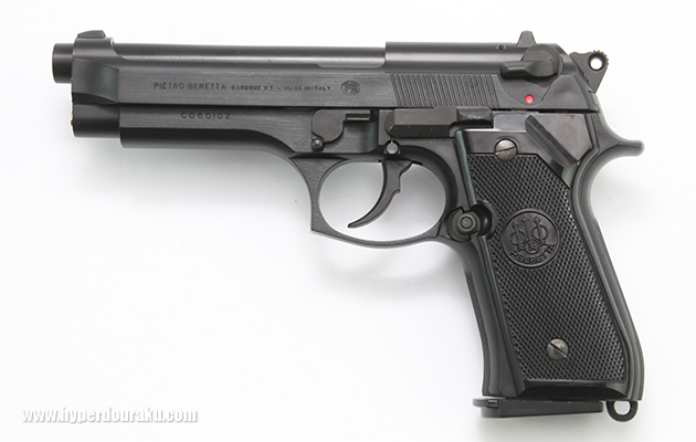 ディバイスに内蔵するマルシン製ベレッタM92Fエアコッキングガン。M92Fのリアルサイズエアガンとしては初の製品で、かなりのヒット作となった。