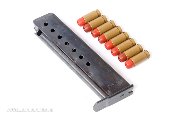マガジンはモデルガンと共用で、カートリッジも後のガスオペレーションガバメントやUZIなどと共用。