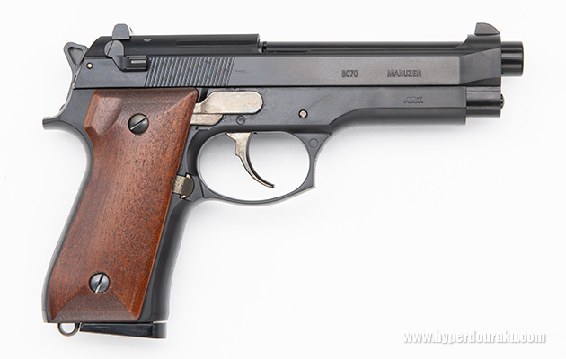 1985年にベレッタM92が米軍トライアルに勝って制式化されると、映画やドラマにも登場して日本国内でも一気に知名度と人気が向上した。マルゼンがモデルアップしたのは制式までの過渡期にあたる92SB-Fというモデル。木製グリップを付けると雰囲気が変わるのも面白い。