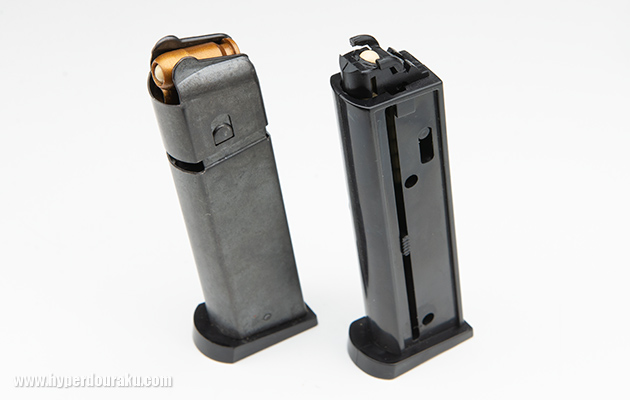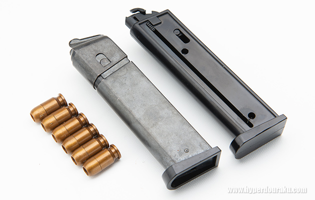 マガジンは2本が同梱される。カート用のマガジンはスチールプレス製で装弾数は6発、ケースレス用マガジンは樹脂製で装弾数12発。