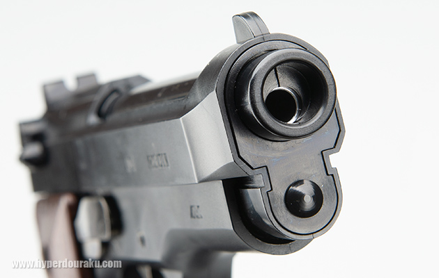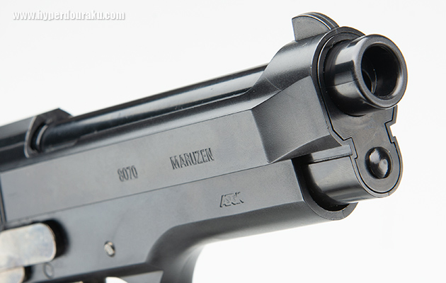 ベレッタ特有の上部が大きくカットされたスライドを再現している。マズル部はちょっと大きめか。