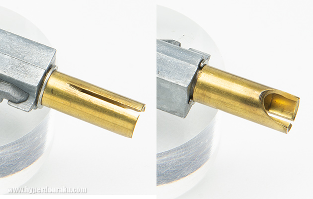 独特な形状の真鍮製インナーバレル。ゴムパッキンはなく、チャンバー上部に設けられたトーションばねがスリットに入り、そのテンションでBB弾が保持される。