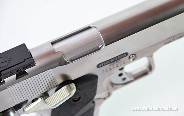 よく見るとスライドの上下幅が若干広い。これは同じメカであるマルイS&W M59にも見られた特徴で、スライド内にガスチャンバーを設けなければならないデザインゆえだと思われる。