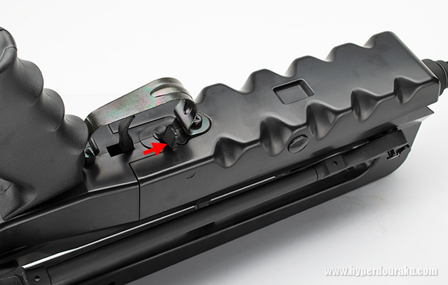 トリガー前のセーフティレバーを回してハンドガードを取り外す。