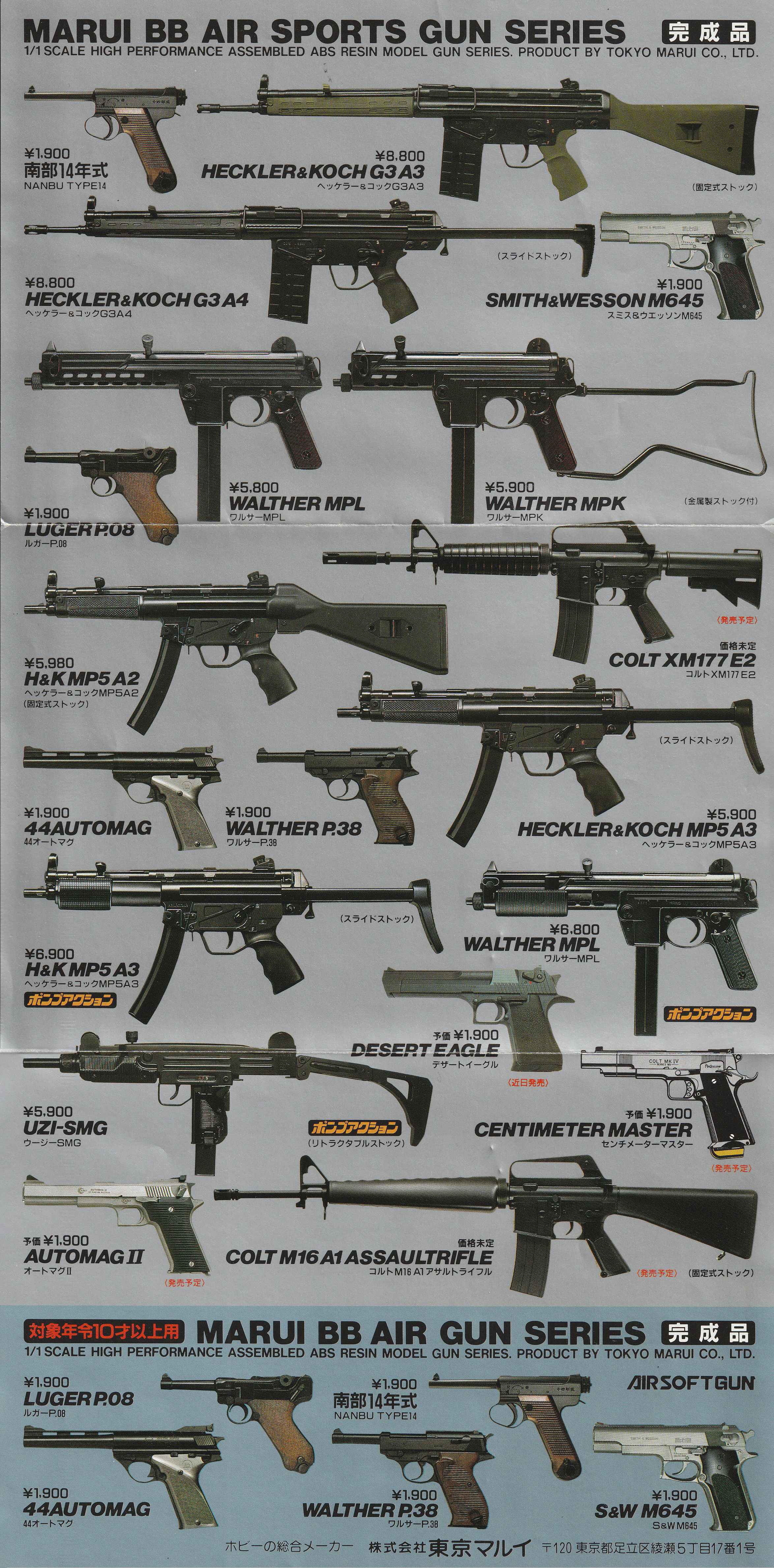 当時のカタログ。ワルサーMPL、H%K MP5、UZIなどの長物エアコッキングガンはすでに発売されており、M16A1、XM177E2は発売予定となっている。カタログ表面、裏面。