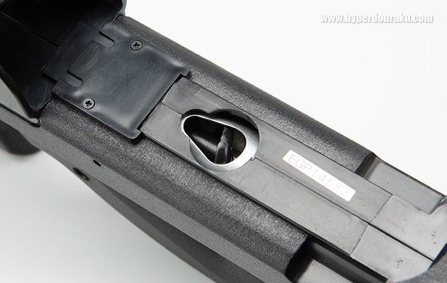 本体側の大きな穴からBB弾がヘリカル給弾機構へ流れていく。ガスガン時代から変わらない方式だ。