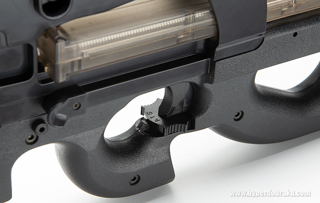 トリガーの前にセレクターがあり、セーフ、セミオート、フルオートで切り替えることができる。