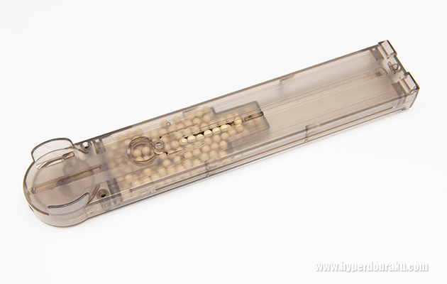 シースルーのマガジンは装弾数500発。トップの回転つまみか、裏面のスイッチで給弾口のシャッターが開く。マガジンフォロアーを引きながらBB弾をジャラジャラと装填する。写真は半分ほど弾を装填したところ。