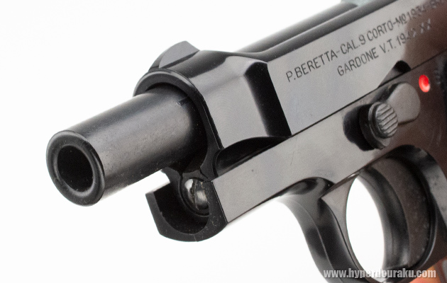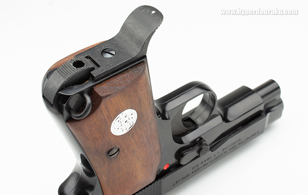 ベレッタの拳銃と言えばこの大きくカットされたスライド上部。M84やM92にも引き継がれていくベレッタ社の特徴となった。フロント、リアサイトはスライド一体の固定式だ。ハンマーは射撃のたびにコックされるがバルブを叩いているわけではなく、トリガー側でバルブを開放している。