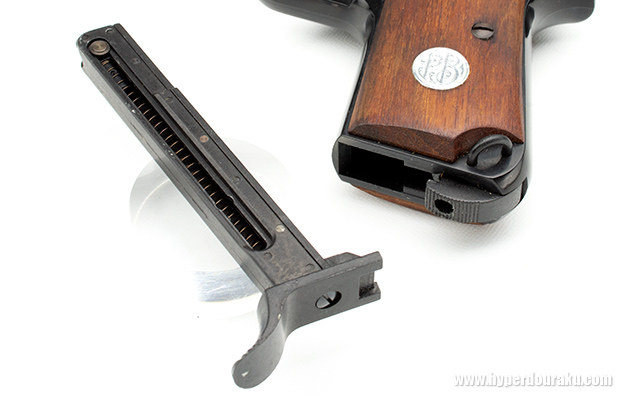 マガジンはダイキャスト製の割り箸タイプ。背面に金属鉤爪のマガジンリップもあり、装弾数は11発。グリップパネルはミリタリーモデルに付属したフランスクルミ製の木製グリップでシルバーのPBメダリオンが入る。