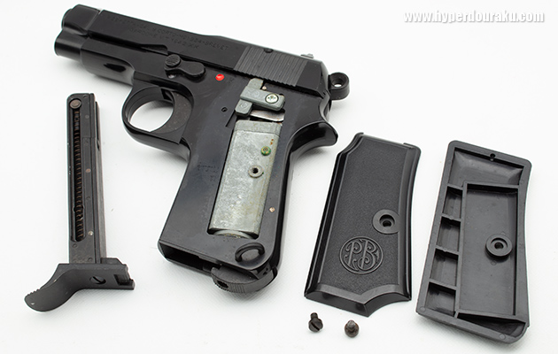 グリップパネルを取り外すとディスコネクターや内蔵式のガスタンクが見える。ノーマルのプラ製グリップパネルにもPBのロゴマークが入る。